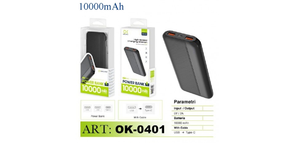 POWERBANK OKLINE 10000mAh nero PVC OUTPUT 2x USB 2.0A. INPUT MicroUsb 5V + Type-C 2.1A.PIU' CAVO TYPE-C 0.5MT NERO.