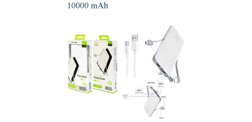 POWERBANK OKLINE 10000mAh BIANCO PVC OUTPUT 1x USB 2.0A, TYPE-C+MICROUSB+LIGHTNING. INPUT TYPE-C, MicroUsb 5V 2.1A.PIU' CAVO TYPE-C 0.5MT BIANCO.