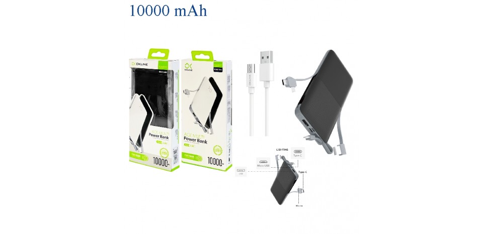 POWERBANK OKLINE 10000mAh NERO PVC OUTPUT 1x USB 2.0A, TYPE-C+MICROUSB+LIGHTNING. INPUT TYPE-C, MicroUsb 5V 2.1A.PIU' CAVO TYPE-C 0.5MT BIANCO.